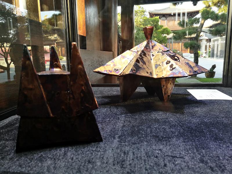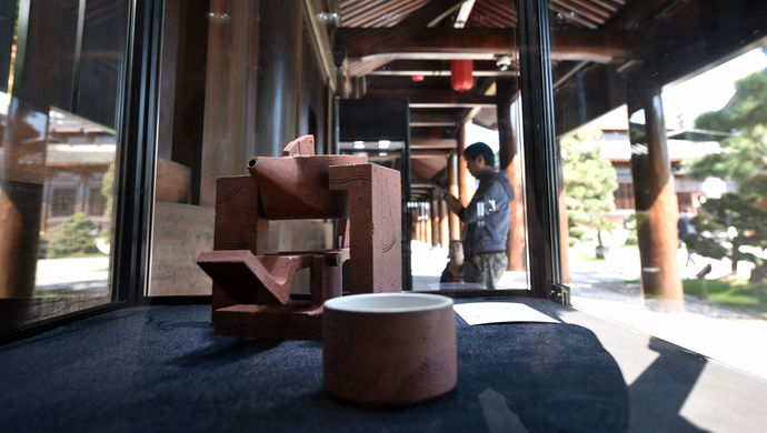 藝術(shù)家謝嘉亨曾留學(xué)西班牙馬德里陶瓷學(xué)院,他最偏愛西班牙國寶釉“閃光釉”。“閃光釉”是十三世紀(jì)阿拉伯人進(jìn)貢皇室時(shí)使用在陶瓷器上的釉彩,色彩繁復(fù)多變,令人贊嘆。展柜中,他的茶具作品《星空》以“閃光釉”燒制而成,帶著濃厚的金屬質(zhì)感。“天氣好的夜晚,星空閃爍,能給人以很大的想象空間。我希望這組茶具既有實(shí)用性,又能給使用者提供一些新的想法。”考慮到寶山寺這個(gè)展出空間的特殊性,謝嘉亨另外選了兩組單色系茶具《藏香》與《藏心》參展,“米色比較內(nèi)斂沉穩(wěn),和《星空》形成了反差。”藝術(shù)家卓銘順的陶壺破具巧思,磚紅色的陶壺利用了機(jī)械原理,通過像蹺蹺板般的組件來上下擺蕩,進(jìn)而推動(dòng)茶壺傾斜,只要通過簡單的按壓就能讓茶壺自動(dòng)倒出茶水。他將茶具取名為《一起玩吧》,意味著飲茶品茗也可以變成一場有趣的互動(dòng)游戲。