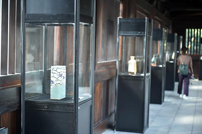 寶山寺雙側(cè)連廊,展柜中的百余件陶瓷作品靜候來客。10月31日,2017“以慈化瓷”——兩岸陶藝文化交流展走進(jìn)羅店鎮(zhèn)練祁河畔的寶山寺,在這個(gè)以榫卯技藝而聞名的建筑中,參觀者既可以欣賞到來自海峽兩岸的陶塑、瓷板及瓷瓶作品,也可以仔細(xì)觀察高溫顏色釉、柴燒、點(diǎn)陶等多種裝飾手法。“慈與瓷同音,是巧合,也是緣分。”策展人陳海波說。