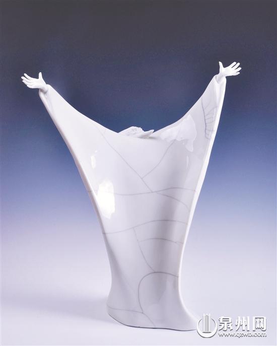 一件《天鵝湖》的作品吸引住記者的注意,三個美麗清秀的少女,身著薄如蟬翼的芭蕾舞裙,足尖輕輕一點,手指柔美舞動……絕美的藝術(shù)造型,讓人怦然心動。紗裙絲絲紋路都非常清晰,讓人在驚贊德化白瓷的晶瑩潔潤的同時,更驚嘆創(chuàng)作者高超的技能。陳桂玉說,1993年她看到芭蕾舞劇《天鵝湖》時被深深打動,于是與丈夫數(shù)月的討論、嘗試、封存,再討論、再嘗試、再封存,于是就有了《天鵝湖》,這件作品獲得首屆中國工藝美術(shù)大師作品精品博覽會金獎。