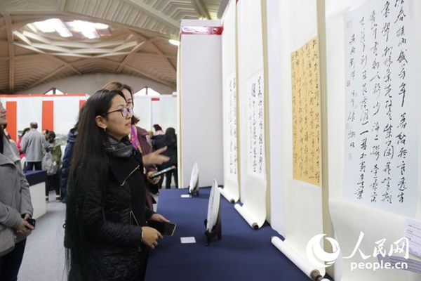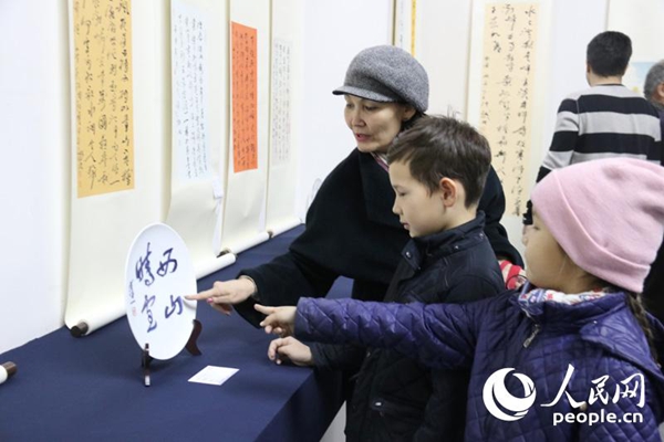哈薩克斯坦觀眾欣賞中國繪畫(記者周翰博攝)
