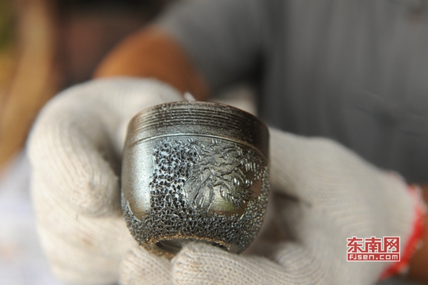 李為成燒制的茶杯,均為手拉坯成型,用刀將表面削成大小均勻的多個平面,再沿著每個平面的邊沿刺上點加以裝飾,形成金光點點的效果。而他用牙簽當(dāng)筆繪出的美麗山水圖案,自然古樸,別有一番韻味。更令人叫絕的是在壺坯成型后,稍晾干,李為成就用尖銳的石頭捶擊壺身表面,形成不規(guī)則又有立體感的紋理,經(jīng)過高溫柴火燒制后,出窯看到的是一個個猶如龍袍的效果,金光閃閃,富麗堂皇。