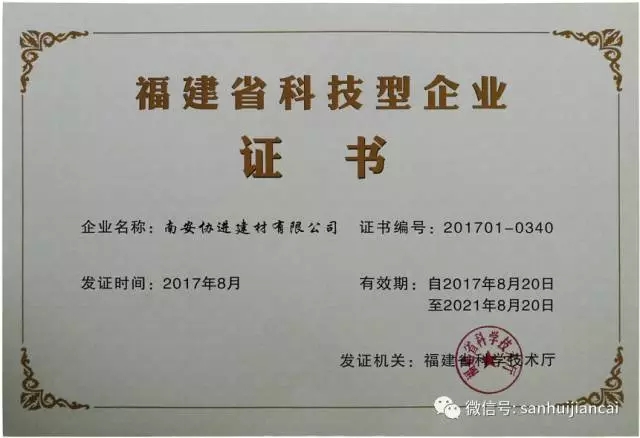 近日,福建省科學(xué)技術(shù)廳公布了2017年第一批福建省科技型企業(yè)名單,南安協(xié)進(jìn)建材有限公司獲認(rèn)定為“福建省科技型企業(yè)”。這是繼2014年后公司第二次獲此殊榮。 自創(chuàng)辦以來(lái),協(xié)進(jìn)人秉承“做優(yōu)秀的人,生產(chǎn)優(yōu)質(zhì)的產(chǎn)品,創(chuàng)造優(yōu)美的生活”的經(jīng)營(yíng)理念,弘揚(yáng)“攜手創(chuàng)輝煌,創(chuàng)新求卓越”的協(xié)進(jìn)精神,不斷創(chuàng)新發(fā)展,先后獲評(píng)“2015中國(guó)建材企業(yè)500強(qiáng)”、“福建省級(jí)創(chuàng)新型企業(yè)”等榮譽(yù)。