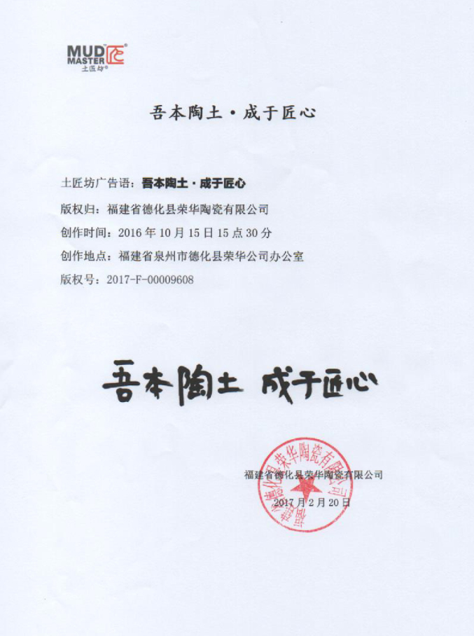 土匠坊廣告語:吾本陶土·成于匠心 版權歸:福建省德化縣榮華陶瓷有限公司 創(chuàng)作時間:2016年10月15日15點30分 創(chuàng)作地點:福建省泉州市德化縣榮華公司辦公室 版權號:2017-F-00009608