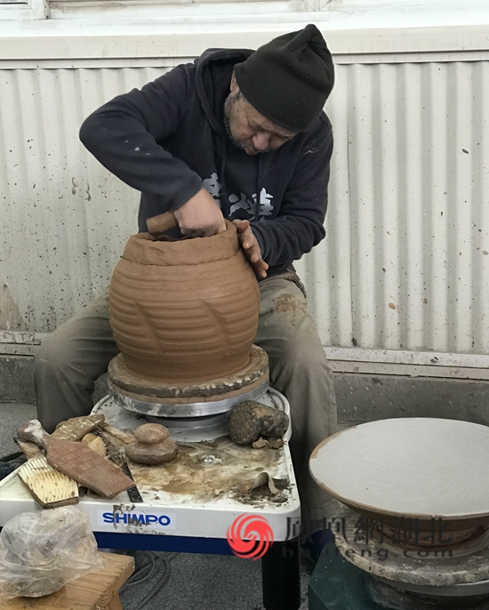 何老清晨到達(dá)陶藝館后一直在工作臺(tái)前制陶,摞泥、拉坯,有條不紊,與一旁的韓國(guó)陶藝家金相基還不時(shí)交流幾句,“韓國(guó)的制陶工藝跟我們還是有區(qū)別的,陶土也不一樣,希望他們有時(shí)間能去我們官窯鎮(zhèn)看看楚陶的技藝。”