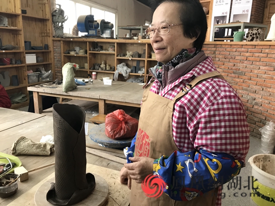 “現(xiàn)在年紀(jì)大了嘛,只能用盤條的形式做陶藝了。”今年70歲的黃美莉老師來自中國(guó)香港特別行政區(qū),做采訪時(shí)她正在創(chuàng)作手中的泥板卷桶,大塊的陶土對(duì)于現(xiàn)在的黃老師老說體力上有點(diǎn)吃不消,才用盤條的方式會(huì)相對(duì)輕松一些,“年輕的時(shí)候我住在英國(guó),隔壁鄰居是一位藝術(shù)家,我那時(shí)候經(jīng)常去他們家里玩,之后就跟著他學(xué),后來回到香港,也去了很多地方學(xué),到現(xiàn)在做陶有四十多年了。”黃老師告訴我們,跟武漢的緣分從十二年前就開始了,“十二年期我來武漢教學(xué)生們雕塑,這一次來感覺這里發(fā)展的很快,設(shè)備、環(huán)境都有了很大的改善。”