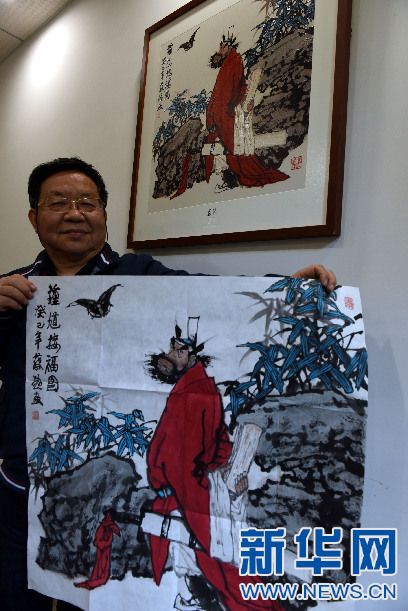 12月8日,著名畫(huà)家、江西美術(shù)家協(xié)會(huì)名譽(yù)主席蔡超在展示國(guó)畫(huà)原作(下)和“瓷上版畫(huà)”作品(上)。新華社記者宋振平攝