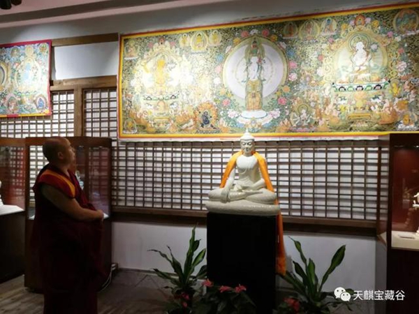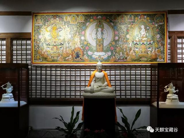 這次展出的作品有“寶藏谷”藏傳佛瓷造像、勉唐畫(huà)派唐卡作品。“寶藏谷”藏傳瓷質(zhì)造像是依據(jù)藏傳佛教《造像度量經(jīng)》的儀軌進(jìn)行嚴(yán)格演算和雕塑,經(jīng)過(guò)火的燒制,顯得細(xì)膩精美,溫潤(rùn)通透,呈現(xiàn)出莊嚴(yán)、肅穆的藝術(shù)效果。