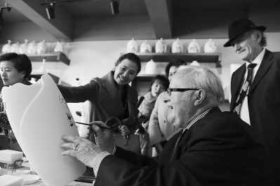 據(jù)悉,洞上陶藝村改制于原三班鎮(zhèn)蔡徑村辦瓷廠,自2013年11月成立陶藝村以來,已吸引各地30多名藝術(shù)家成立創(chuàng)意工作室23家、陶藝DIY體驗(yàn)區(qū)4處,年接待游客近8萬人次。圖為德國友人在陶瓷坯體上簽名。