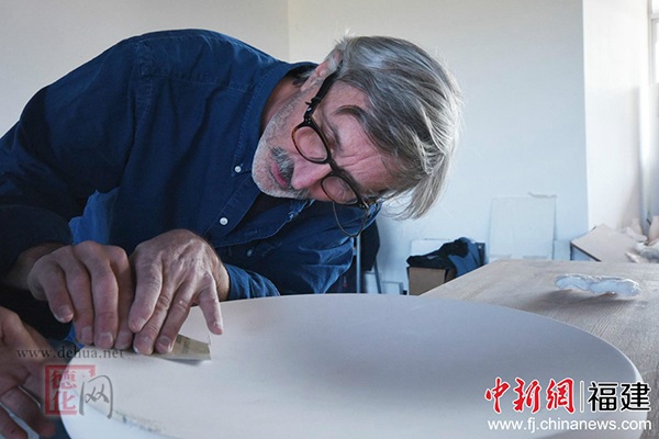 瑞土日內瓦大學陶藝系教授Philippe Barde(菲利普- 巴爾德)在給餐盤打磨。