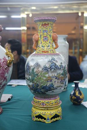 在擺滿各種顏色、不同外觀瓷器的大方桌上,記者看到一只可以轉(zhuǎn)動(dòng)的瓷瓶。崔紀(jì)文介紹說(shuō),這是乾隆粉彩山水紋象耳盤口轉(zhuǎn)心套瓶,由瓶體、底座和內(nèi)心三部分組成,高60厘米,口徑16厘米,底徑18厘米。據(jù)史料記載,乾隆八年,御用督陶官唐英為博得乾隆皇帝的歡心,在景德鎮(zhèn)御窯場(chǎng)創(chuàng)燒成功了我國(guó)古代制瓷史上設(shè)計(jì)精巧、工藝復(fù)雜的三種瓷器樣式:套瓶、交泰瓶和轉(zhuǎn)心瓶,并奏請(qǐng)乾隆皇帝御審。其中,工藝最為復(fù)雜的正是將套瓶、交泰瓶和轉(zhuǎn)心瓶幾種樣式結(jié)合的轉(zhuǎn)心套瓶,此種轉(zhuǎn)心套瓶巧奪天工,費(fèi)時(shí)、費(fèi)工、費(fèi)料,更不易仿制,連乾隆皇帝也覺(jué)得其工藝過(guò)于復(fù)雜,在唐英的奏折上批復(fù)“不必照隨常瓷器一樣多燒”,由此可見(jiàn)其珍貴程度。