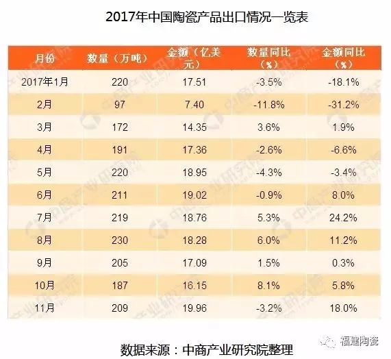 據(jù)中商產(chǎn)業(yè)研究院發(fā)布的《2017-2022年中國陶瓷產(chǎn)品行業(yè)市場前景及投資機會分析報告》數(shù)據(jù)統(tǒng)計統(tǒng)計顯示:2017年11月中國出口陶瓷產(chǎn)品209萬噸,同比下滑3.2%;1-11月中國出口陶瓷產(chǎn)品出口2151萬噸,與去年同期相比增長2%。11月中國陶瓷產(chǎn)品出口金額19.96億美元,同比增長18%;1-11月,我國陶瓷產(chǎn)品出口金額達176.17億美元,同比增長9.7%。