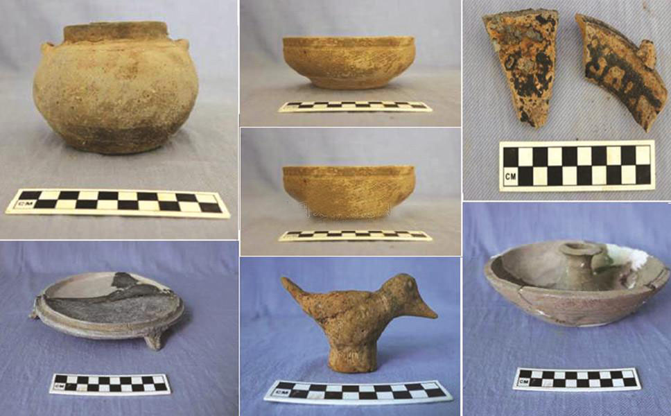 出土遺物以陶器為主,另有瓷器、窯具、磚、瓦等,共收集陶瓷片等200余袋,完整及可修復的小件器物100余件。陶器多為泥質灰陶,火候較低,器類有罐、盆、碗、燈盞、刻槽盆、甑等,另有雞、鴨、羊等家禽家畜模型。瓷器以醬釉為主,亦有青黃釉,胎釉結合較差;胎土細膩,胎質較為堅硬,胎體為褐色或白色;器類有碗、盤口壺、罐等,部分帶釉的器物,將釉剝離后,與陶器無異,當為低溫釉陶器。