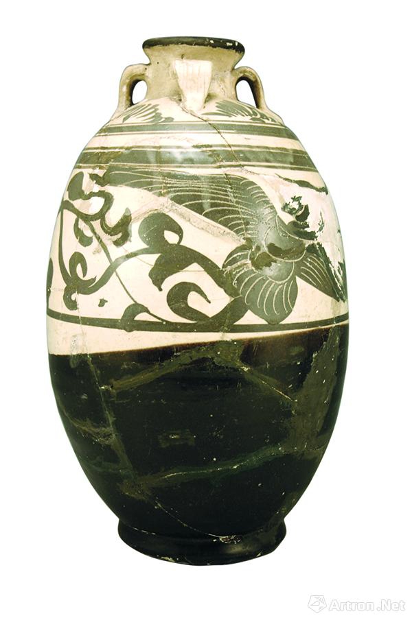 白地釉下黑彩工藝過(guò)程是在成型的坯上,先敷一層潔白化妝土,然后用細(xì)黑料繪畫(huà)紋樣,再在上面施一層薄而透明的玻璃釉,入窯燒成,黑白兩色形成強(qiáng)烈對(duì)比。白釉黑彩的取材比較廣泛,取材于自然界中的植物、動(dòng)物和人物故事,生動(dòng)親切,情趣濃郁。布局上以傳統(tǒng)的中國(guó)畫(huà)寫(xiě)意手法結(jié)合圖案變化特點(diǎn),畫(huà)面既簡(jiǎn)潔又生動(dòng),同時(shí)還借鑒金銀器、漆器和織繡工藝來(lái)豐富自身的裝飾,對(duì)磁州窯的彩繪有一定程度的影響。鎮(zhèn)江博物館藏有一件元代磁州窯白地黑彩劃花紋瓷罐(圖1),高22.5、口徑15.8、底徑10.1厘米。直頸,溜肩,肩下內(nèi)收,暗圈足。全器繪鳳穿纏枝花卉紋,頸、肩及近底部各繪兩周弦紋。其底色與紋飾色彩的對(duì)比強(qiáng)烈,黑白分明,頗似中國(guó)水墨畫(huà),運(yùn)筆灑脫、簡(jiǎn)練、活潑,具有濃郁的北方氣韻。