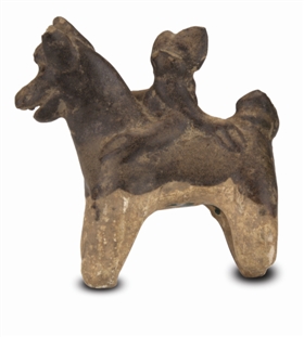 圖1所示為宋褐釉童子騎狗瓷塑,長6厘米,寬3.4厘米,高6.1厘米;器身為褐色,四足露胎無釉,狗背上童子造型夸張,頭戴尖頂帽子,淺刻雙目,五指尖長刻畫清晰。右手在前,左手在后,身體挺直,作騎馬狀。狗頭稍偏左側(cè),雙目深陷,嘴張開,狗尾呈盤旋狀翹起。一幅憨態(tài)可掬的童子騎狗圖躍然紙上,讓人流連往返。