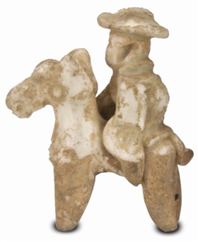 圖2為宋白釉老翁騎馬瓷塑,長3.8厘米,寬2厘米,高4.2厘米。馬四足露胎無釉,馬頭部夸張,馬上坐一老翁,頭戴斗笠,雙目深陷,身著寬袖衣衫,手五指呈伸展狀且刻畫清晰,右手在前放于馬頸,左手下垂放在馬腰上。雙腿夾緊馬肚,扭身躬背做騎馬狀。馬雙目圓睜,大耳直立,長嘴微合,似作呼呼喘息狀,馬尾較短。