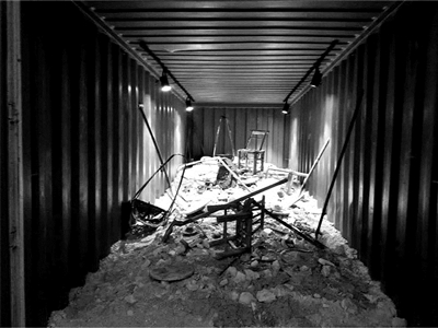 一個(gè)集裝箱,內(nèi)有一方土堆,各式制瓷工具無規(guī)則擺開,原始、粗糙與凌亂……