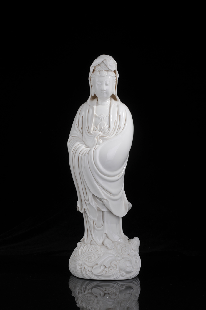簡介:該《渡海觀音》由中國青年陶瓷藝術(shù)家設(shè)計(jì)制作,以德化特有的溫潤如玉的“中國白”為胎質(zhì),純手工制作,作品圓勁有力如凝脂似玉,滋潤瑩滑,神情嫻雅平靜,安詳自若,雙目低垂凝思,衣紋線條清晰、簡潔、瀟灑,多變化,柔媚流暢,翻轉(zhuǎn)自然,觀音雙手藏袖,露一足踏蓮花,另一足水花掩蓋,作踏浪凌波渡海之勢刻畫的栩栩如生。經(jīng)高溫1300多度燒制,整尊造像美倫美煥,活靈活現(xiàn),是一件上乘之品。