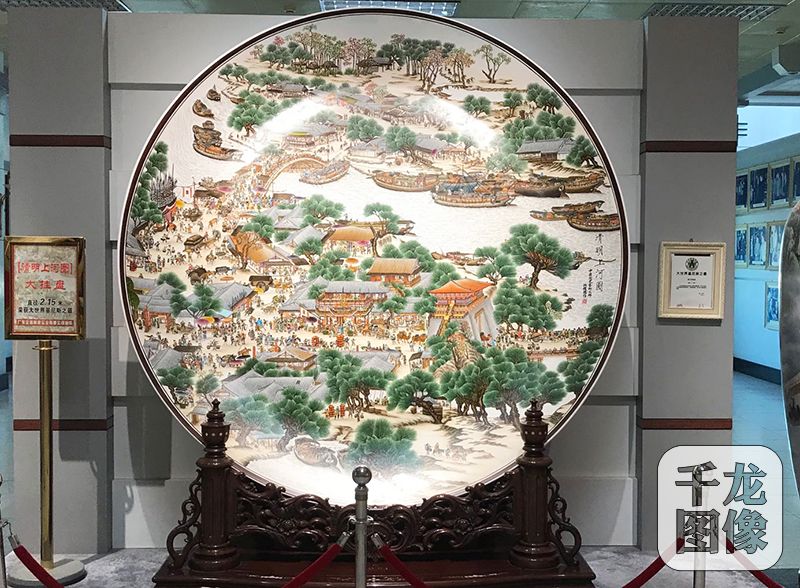 走進(jìn)陳列館,一幅長(zhǎng)達(dá)62米的大型浮雕瓷壁畫《清明上河圖》直接映入眼簾,該壁畫獲大世界基尼斯之最,同獲該獎(jiǎng)項(xiàng)的還有直徑達(dá)2.15米的特大型瓷掛盤。