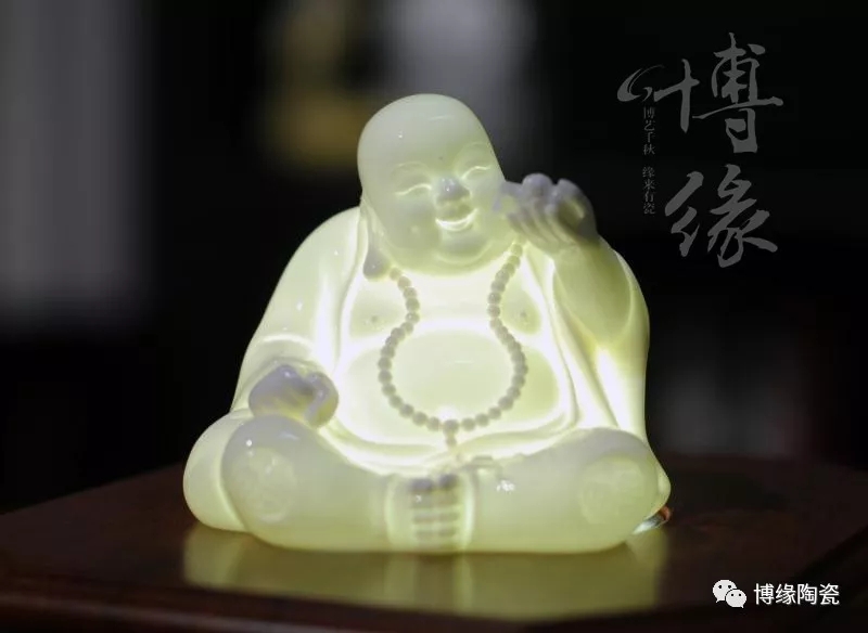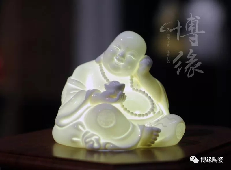 彌勒擺件系列作品,精選上萬(wàn)元每噸原瓷泥料,經(jīng)過(guò)精心加工,其含雜質(zhì)少,瓷質(zhì)白,白度高達(dá)95%,是白瓷中之精品,在光照之下,白如凝脂,透潤(rùn)如玉,胎釉透亮。