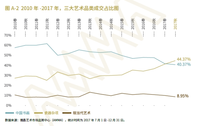 所以,從各板塊成交的走勢(shì)圖來(lái)看,瓷雜板塊拍品在成交上,上升趨勢(shì)明顯;而中國(guó)書畫板塊的成交占比,已連續(xù)三年下降。