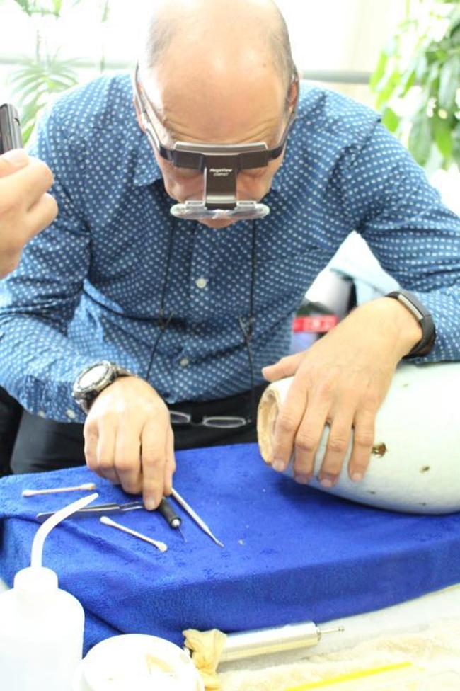 以陶器為例,鉆取約100毫克的少許樣品粉末即足夠進(jìn)行測(cè)試。為了保持測(cè)試高度準(zhǔn)確,取樣需要在暗室紅光下進(jìn)行。取樣部位及數(shù)量取決于器物的大小及完整與否。瓷器要用涂有金剛砂、直徑4毫米之空心鉆,在冷水沖洗下取樣。樣品通常取自無釉處,如器底或器足內(nèi)壁。所有樣品密封后送至英國(guó)牛津檢測(cè)中心數(shù)據(jù)庫之化驗(yàn)室進(jìn)行測(cè)試。