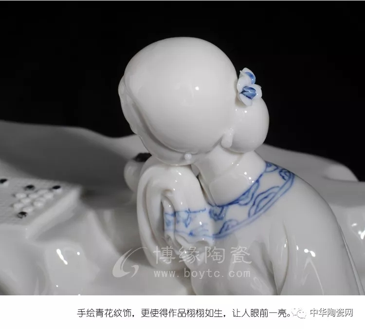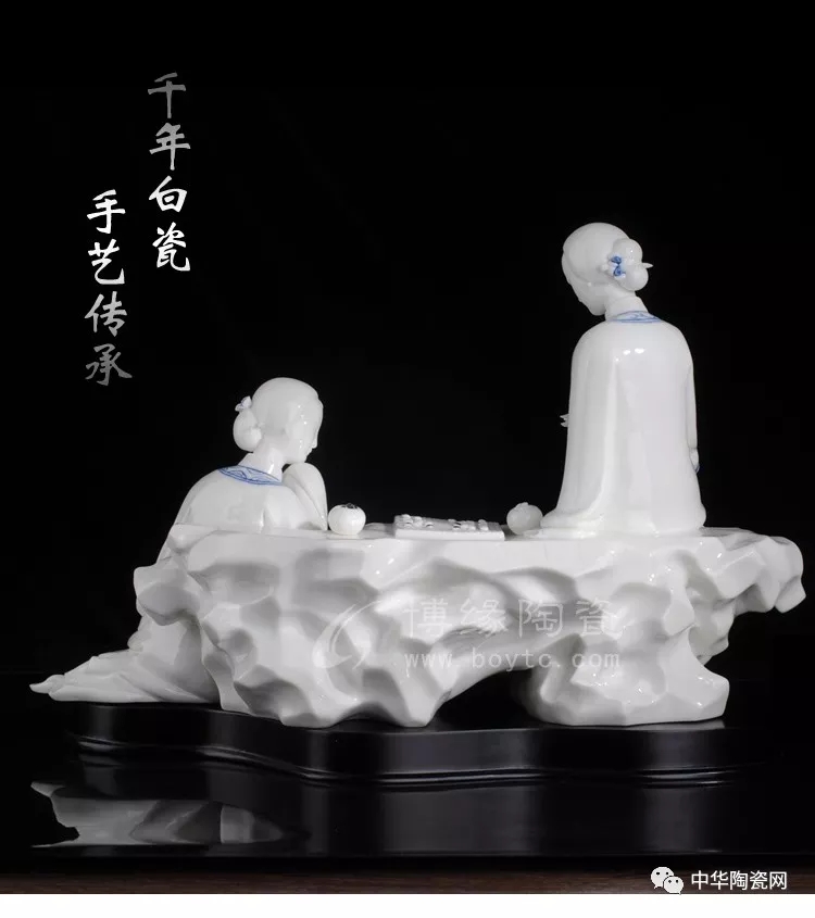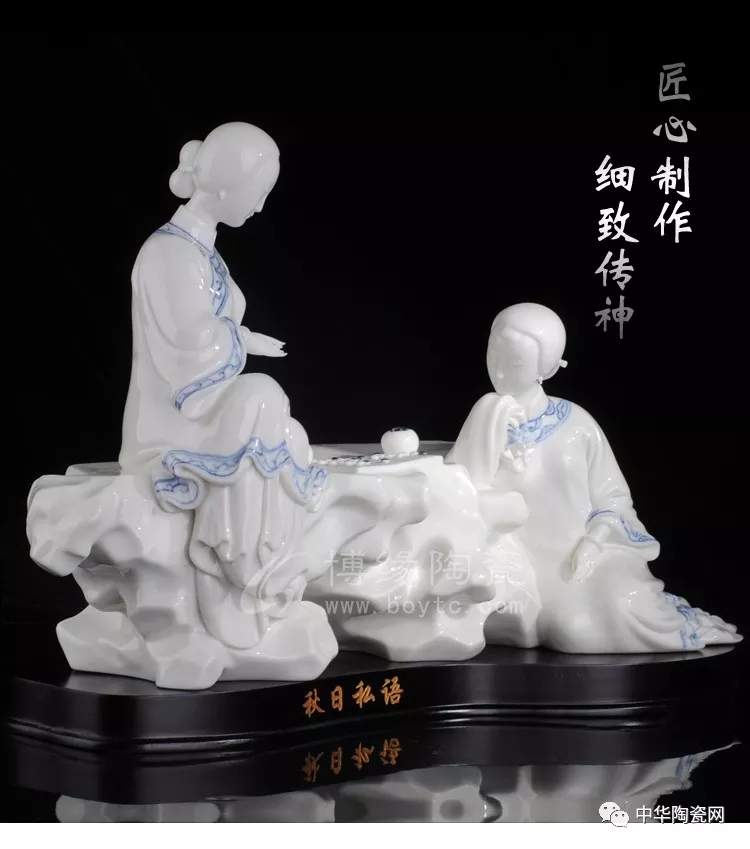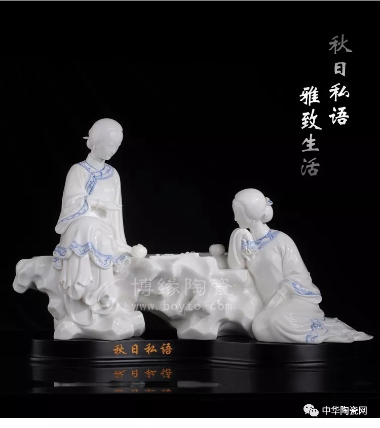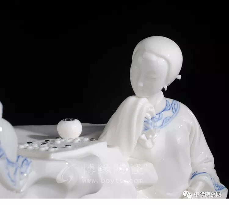 《秋日私語(yǔ)》作品采用德化傳統(tǒng)瓷雕技藝,把人物神態(tài)、衣紋細(xì)節(jié)、整體構(gòu)思,描繪的栩栩如生,一個(gè)手持棋子將落未落,又一人托住下巴,好似在思索,一動(dòng)一靜的結(jié)合巧合天工,加之手繪青花紋飾,使得作品更加豐滿。