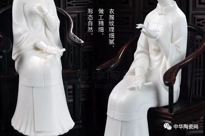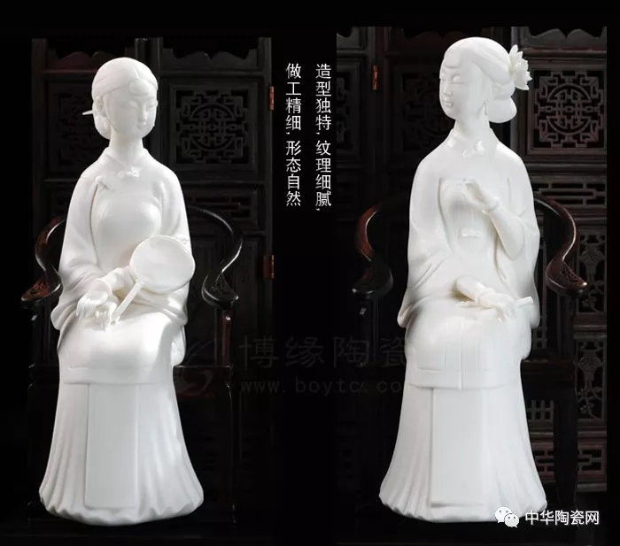 德化陶瓷作品創(chuàng)作題材豐富,其中仕女也是一大題材之一,自古以來,以四大美女、唐清仕女等人物創(chuàng)作的作品比比皆是。因德化白瓷細(xì)膩,可塑性強(qiáng),適合仕女作品創(chuàng)作,所創(chuàng)作品人物傳神,雕刻精細(xì)。