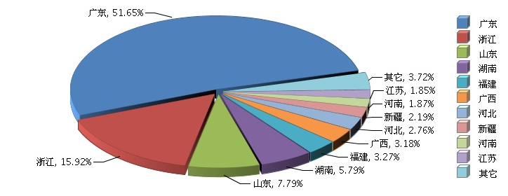 據(jù)海關數(shù)據(jù)顯示,2017年我國陶瓷餐具出口主要集中在廣東、浙江,兩省陶瓷餐具出口占我國陶瓷餐具出口總額的近70%,其中廣東完成累計出口額26.63億美元(同比增長1.08%),占51.65%;浙江完成累計出口額8.21億美元(同比增長-0.8%),占15.92%。從出口增速看,河南、江蘇兩省增速居前,其中河南同比增長26.91%;江蘇同比增長24.91%;出口前十地區(qū)中,僅新疆、河北、浙江同比下降,分別為-11.46%、-3.26%、-0.80%。