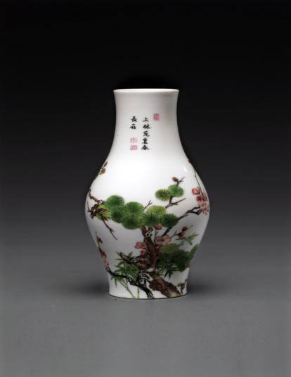 清代還有進一步的創(chuàng)新,出現了粉彩、琺瑯彩和釉里三彩。這些創(chuàng)新均產生于清代全盛的康雍乾時代。粉彩始于康熙年間,成型于雍正,粉彩色彩糅合,皴染豐富,直至袁世凱稱帝時還有燒造所謂“洪憲”粉彩器,m瑯彩誕生于歐洲,清廷平定臺灣開放商貿后引進中國,清代琺瑯彩尤其乾隆年間的特色表現為精密繁復,雍榮華貴。釉里三彩又稱釉下三彩,是康熙朝集青花、釉里紅、豆青三種色彩于同一器上的新品種,由于燒造技術頗為復雜,流傳后世的器物較少。清代后期陶瓷業(yè)制造業(yè)隨著國力衰退日益衰落,雖然嘉慶朝粉彩瓷、道光朝青花山水、咸同年間的一些彩器也不乏精品,但總的荒頹趨勢已經不可逆轉。