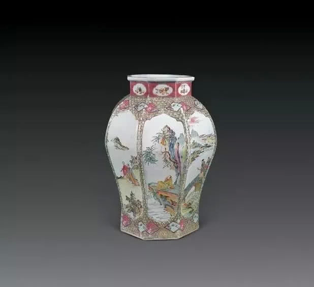 雍正粉彩八面開(kāi)光山水人物大罐