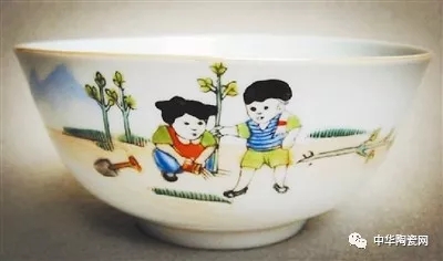 青山綠草風(fēng)光美,少年兒童植樹忙。粉彩綠化大碗(圖一),口徑11.3厘米,高5.2厘米。腹部印花打框手工填色繪制的山水、人物綠化植樹圖案:男同學(xué)一手扶住剛剛栽上的樹苗,一手放在腰間;女同學(xué)彎著腰給樹苗澆水。左邊是剛剛栽上的兩株樹苗和一把鐵锨,右邊放著未栽的樹苗。遠(yuǎn)處是成片的樹林,郁郁蔥蔥,如同一片綠色的海洋。再遠(yuǎn)處墨綠的青山,充滿生機(jī)和希望。