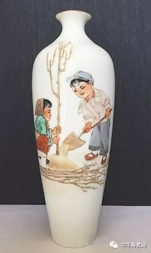 春暖花開萬(wàn)物蘇,陽(yáng)春三月植樹時(shí)。粉彩植樹節(jié)筆筒(圖二),口徑11.5厘米,高約15厘米,白瓷質(zhì)地,造型宛如竹節(jié)。這幅精工描繪的“山野植樹圖”,遠(yuǎn)方青山連綿,近處蒼松挺拔。山石嶙峋間,紅梅朵朵盛開。兩個(gè)小男孩,一個(gè)扶樹,一個(gè)刨坑,忙得熱火朝天。而他們后面,一個(gè)男孩也扛著鐵锨急匆匆趕來(lái)幫忙。另一個(gè)女孩扛著一面紅旗從遠(yuǎn)處走來(lái),顯得那樣朝氣蓬勃。筒壁的另一面是楷書的“植樹節(jié)”“一九六五年春月”題款,標(biāo)明了這只筆筒的生產(chǎn)年代。