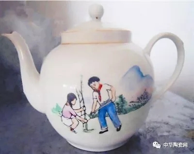 青山綠水春意濃,正是植樹好時(shí)機(jī)。粉彩植樹茶壺(圖三),高14厘米。腹部圖案展現(xiàn)的兩個(gè)戴著鮮艷紅領(lǐng)巾的少先隊(duì)員植樹的情形:女少先隊(duì)員蹲著用雙手扶好樹苗,男少先隊(duì)員拿著鐵鏟給小樹培土。旁邊是剛剛栽上的樹木,小樹枝上已經(jīng)發(fā)芽,顯示出勃勃生機(jī)。遠(yuǎn)處青山蒼翠,綠樹成蔭,鮮花爛漫,呈現(xiàn)出一派春意盎然的美景。該壺釉面細(xì)膩,圖案清新,人物栩栩如生,設(shè)色艷麗,畫面風(fēng)格、人物衣著都富有濃郁的時(shí)代色彩。