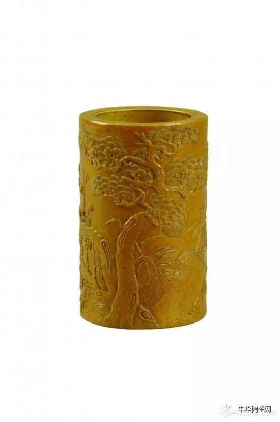 圖1:“黃戚福”款黃釉雕瓷松竹梅紋筆筒