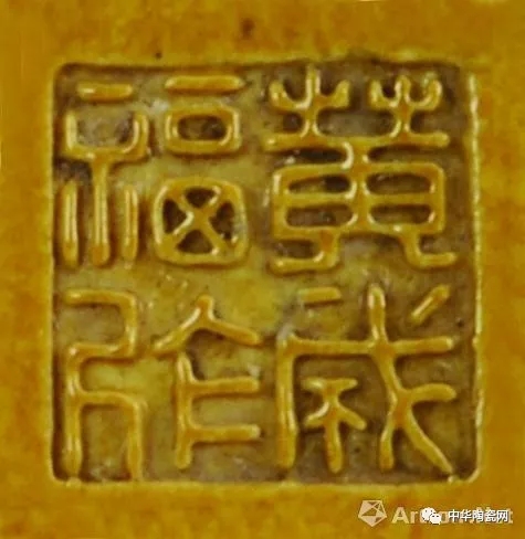 這件“黃戚福”款黃釉雕瓷松竹梅紋筆筒(圖1),高12.7、口徑7.9、底徑7.8厘米,是上世紀50年代安徽省博物館在合肥市征集入藏的一件雕瓷工藝精品,2002年出版的《安徽省博物館藏瓷》一書中就收錄有這件雕瓷筆筒。此筆筒平唇,直筒形,圈足,通體施黃釉,從造型到顏色都酷似竹雕筆筒。筒身一周刻松、竹、梅“歲寒三友”圖案,雕工精細,以刻刀將瓷地剔除,以陽紋的形式突出紋樣,表現了蒼松之挺拔、修竹之傲骨、臘梅之多姿,整個圖案渾然一體,典雅莊重,意境高遠。而在筆筒的底部,還刻有“黃戚福作”四字陽文篆書印章款(圖2)。從整體風格來看,該筆筒應為清代中后期作品。