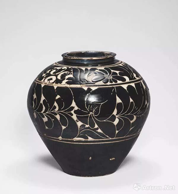 金至元黑釉剔刻花牡丹紋罐,形制周正,氣韻挺拔。外壁采用雙層化妝土的剔花手法裝飾纏枝牡丹、卷葉紋,黑白分明。黑釉發(fā)色純正,釉面厚潤(rùn)具質(zhì)感,不同于泛褐色的常見(jiàn)品,白色也是純度極高,比常見(jiàn)的泛黃或直接露底胎者高級(jí)很多。經(jīng)轉(zhuǎn)流傳數(shù)百年,除釉面的輕微使用痕跡外,品相完整,釉光滋潤(rùn),可稱珍品。28.5 cm 高 估價(jià): HK$ 800,000 - 1,000,000  來(lái)源:香港私人收藏,購(gòu)于1980年代