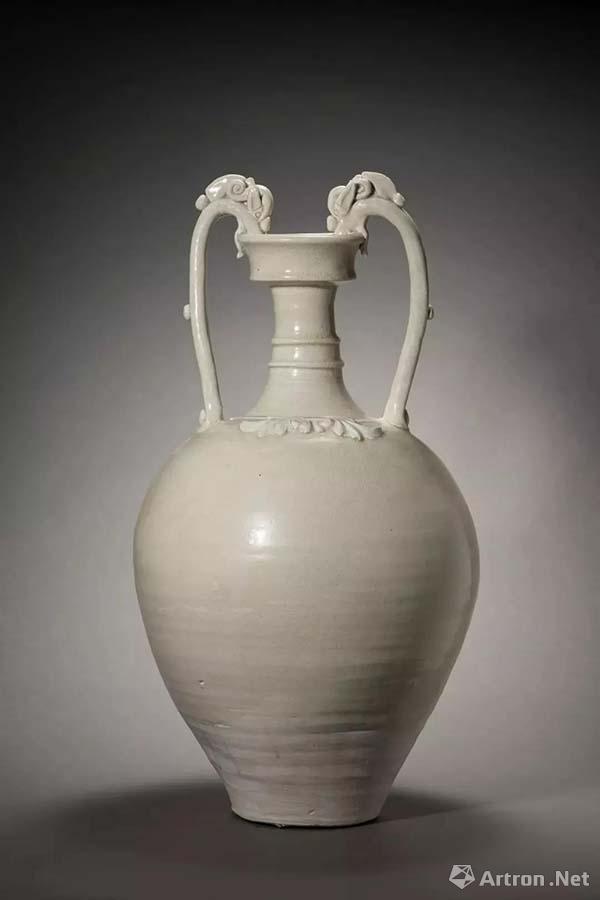 白釉雙龍柄瓶,河南鞏縣窯制品,體型碩大,氣勢(shì)非凡。雙龍瓶多見(jiàn)素身器,帶有模印貼塑花紋者較為少見(jiàn),本器肩部對(duì)稱貼塑兩組卷葉紋,十分精致,品級(jí)甚高。