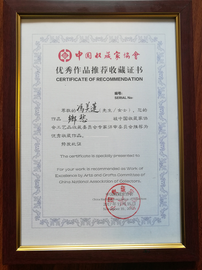 作品《鄉(xiāng)愁》中國收藏家協(xié)會工藝品收藏委員會評審為優(yōu)秀作品