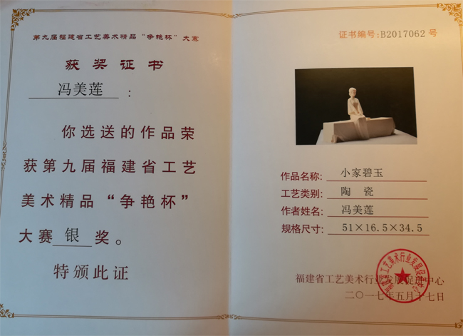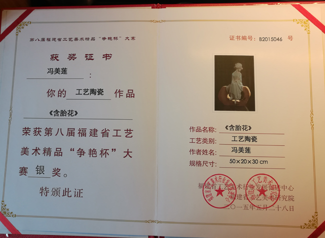 2015年《含胎花》獲第七屆福建省工藝美術(shù)精品“爭艷杯”大賽銀獎(jiǎng);