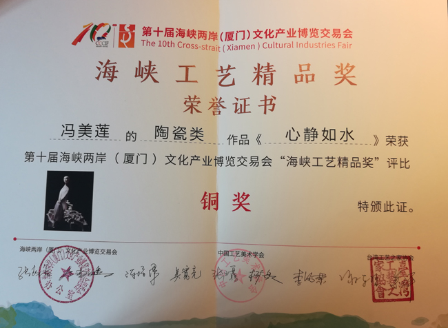 作品《心靜如水》在“海峽工藝精品獎(jiǎng)”評獎(jiǎng)中榮獲銅獎(jiǎng)
