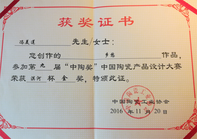 2016年《鄉(xiāng)愁》獲中國陶瓷工業(yè)協(xié)會主辦的第九屆“中陶杯”中國陶瓷產(chǎn)品設(shè)計(jì)大賽“淇河”杯金獎(jiǎng)、第九屆海峽兩岸(廈門)文化產(chǎn)業(yè)博覽交易會“中華工藝精品獎(jiǎng)”金獎(jiǎng)。