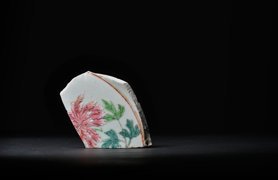 這塊瓷片上有很多值得關(guān)注的細(xì)節(jié):可以明顯看到畫面和色彩受到的磨損,因?yàn)樗械念伾几≡谟缘谋砻妫⒉皇艿接詫拥谋Wo(hù),青花瓷就沒有這樣的危險(xiǎn);綠色顯得比較薄,而粉紅色花頭的部分則具有一定的厚度;綠色的葉子刻意使用了兩種不同的色調(diào),但每一種綠色只負(fù)責(zé)一片樹葉,而花頭則不同,可以看出粉紅色努力展現(xiàn)的細(xì)微變化,由深至淺或由淺至深,粉紅色最淡的地方,變成了白色;奇怪的是,瓷器本來(lái)就是白的,而花頭的白色卻又是堆在瓷器表面的一層,帶有厚度,質(zhì)感上也與瓷器的白色很不同。