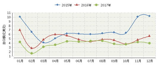 2017年我國陶瓷磚出口量價持續(xù)跌落,其中出口額下降幅度繼續(xù)高于出口量降幅。據(jù)海關(guān)數(shù)據(jù)顯示,2017年1~12月我國陶瓷磚累計出口金額44.26億美元,同比下降19.98%;出口量9.08億平方米,同比下降8.56%。從連續(xù)三年月度出口額對比情況看,2017年各月出口額基本低于上兩年水平, 僅7月份出口微弱正增長