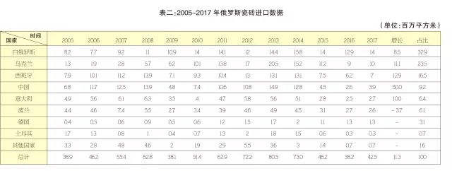 從近十余年,俄羅斯瓷磚進口的詳細情況來看,中國瓷磚在俄羅斯市場優(yōu)勢不明顯。尤其是2015年至2017年期間,中國瓷磚流向俄羅斯的量大大減少(數(shù)據(jù)詳見表二)。