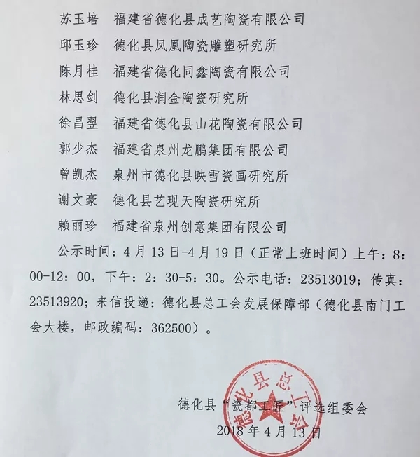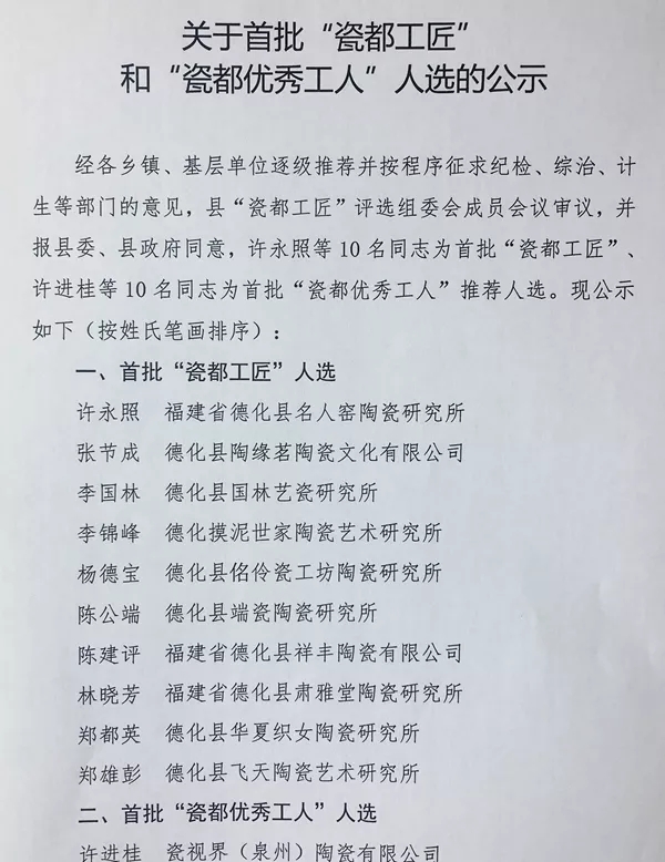 核心提示:德化縣“瓷都工匠”評(píng)選組委會(huì)關(guān)于首批“瓷都工匠”和“瓷都優(yōu)秀工人”人選的公示如下: