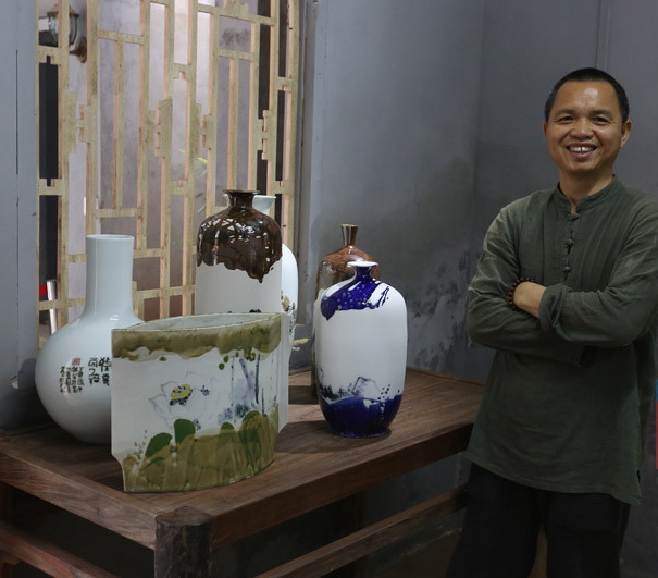 “以前用的都是景德鎮(zhèn)的陶瓷制作技術(shù),每次去參賽都會被誤解是景德鎮(zhèn)陶瓷,我想做一種屬于廣西的美術(shù)陶瓷。”但怎樣才能突出廣西本地特色呢?楊綱雄一直在思考,也一直在嘗試。他去采購賓陽的瓷泥,在瓷器上作畫,把現(xiàn)代色彩和傳統(tǒng)的山水畫相結(jié)合,創(chuàng)作出來的作品在西安參賽獲獎。