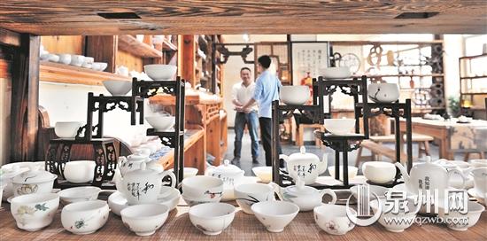在德化成藝陶瓷有限公司的展廳里,不同款式的茶具整齊地?cái)[放在展柜上,供前來參觀的客戶們參觀、了解。這家成立于1997年的企業(yè),同樣專注中高端陶瓷茶具的研發(fā)、生產(chǎn)和銷售,通過線上線下結(jié)合,產(chǎn)品銷往全國(guó)各地。“雖然我們是小作坊起家,但在發(fā)展過程中一直注重產(chǎn)品開發(fā)設(shè)計(jì)和品質(zhì)把控,產(chǎn)品備受消費(fèi)者青睞。”該公司行政部負(fù)責(zé)人陳志強(qiáng)介紹,去年,金磚國(guó)家領(lǐng)導(dǎo)人廈門會(huì)晤期間,該公司設(shè)計(jì)贊助的繪有會(huì)標(biāo)的迎賓會(huì)議杯得到大家的認(rèn)可,也為企業(yè)帶來了源源不斷的訂單。