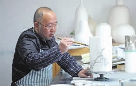 在位于醴陵瓷谷的醴泉窯藝公司里,陽光透過窗戶溫暖著整個(gè)工作室。室內(nèi),釉下五彩手工藝人黃彪神情專注在瓷板上。他時(shí)而駐足冥思,時(shí)而調(diào)色運(yùn)筆,一會(huì)兒工夫,鮮艷的畫面在瓷板上慢慢地呈現(xiàn)出來。