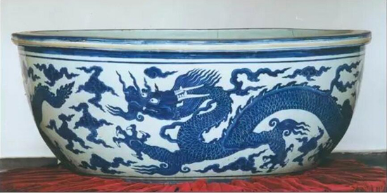 綜合史料上的分析,正統(tǒng)時(shí)期燒造的龍缸很有可能是為防火患的消防水缸,也有說法為養(yǎng)荷、養(yǎng)魚之用。頤和園收藏的此件龍缸年代也符合正統(tǒng)燒造龍缸的時(shí)代背景。燒造大口徑的龍缸難度極大,即使到了明代晚期也不易燒造,曾出現(xiàn)過萬歷二十七年景德鎮(zhèn)御窯廠窯工童賓被逼燒造龍缸未成,而殉窯的事件,可見其燒造難度之大。目前資料未見明代有超過94厘米口徑龍缸的記述,頤和園收藏的明代早期青花云龍紋缸有著極高的學(xué)術(shù)研究價(jià)值,可謂撼世之寶,龍缸之王。