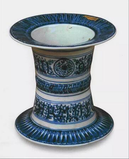永樂青花無擋尊,口徑17.2厘米,底徑17厘米,高17厘米。尊身中空為筒狀,上、下口部寬折沿。器物整體紋飾布局,呈帶狀裝飾,口和底沿飾以菊瓣紋;尊身上、下繪以纏枝、團(tuán)形圖案及阿拉伯文;中間飾以仰、覆蓮瓣紋。永樂、宣德官窯青花瓷器使用進(jìn)口的蘇麻離青,青花發(fā)色鮮艷古樸,有暈散效果,鐵銹斑痕跡明顯,而此器亦同。無擋尊是仿阿拉伯銅器造型制作,乾隆皇帝曾作有兩篇《詠宣德窯無擋尊》詩文,其一: